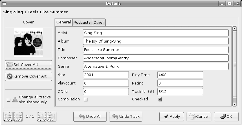 Tag editing, including album cover images, is another area in which gtkpod can prove quite useful. Click any track in the playlist, select Edit Details, and the Details window for that track will appear (Figure 16-5). In that window you can edit all of the tag entries (artist, album, track title, genre, and so on), and, very importantly, you can set the album cover art for the track. Once you have finished making your changes, click the Apply button, and then click OK.