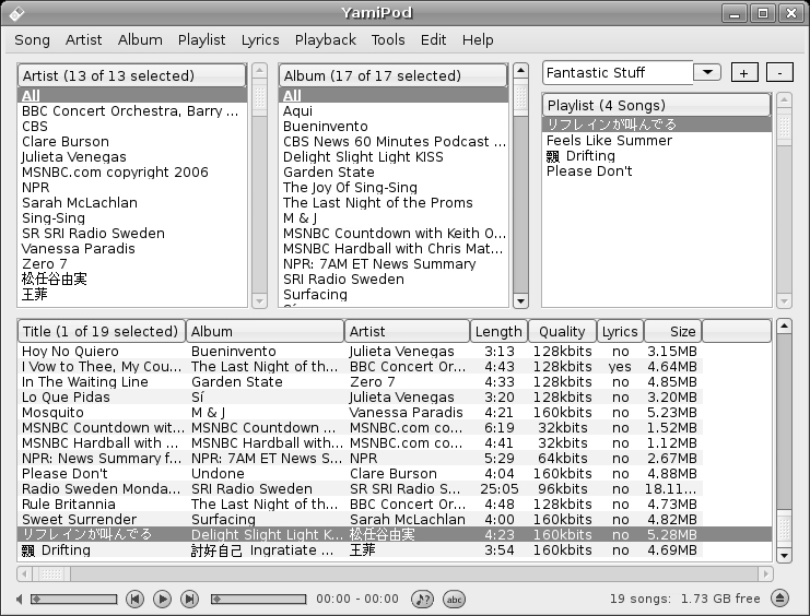 A relative newcomer to the iPod file management arena is YamiPod. YamiPod, which also comes in Mac and Windows versions, looks like a cleaned-up version of gtkpod; YamiPod's layout is more straightforward, making it easier to use in many ways. It also allows audio-direct, helper-less playback (which gtkpod doesn't), and it is easier to deal with in terms of playlist creation and handling.