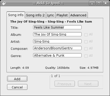 If your iPod already has songs on it that you ripped using iTunes, you will be happy to know that such MP3s pose no problem. They are MP3s, after all. If, however, you have files encoded in iTunes' default AAC format, you should be aware that Linux does not have much in the way of playback support. Only XMMS, installed along with the XMMS-MP4 plugin, seems to provide an easy way for you to play such files. As for the protected AAC files you might have bought from the iTunes store—well, forget about playing those back on Linux. Nevertheless, these playback support limits shouldn't prove to be a problem—you can still add regular or protected AAC files to playlists, copy them to your hard disk, and delete them from your iPod in Linux.