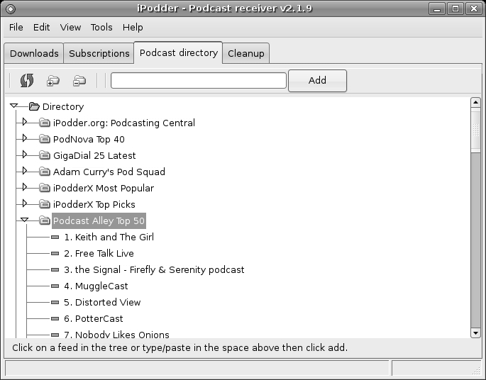 The result of these facts is that if you want to look for podcasts and add them to your iPod's library, you will have to do a little more work than you're used to. One application that can help is iPodder (Figure 16-8), which you can download and install via Synaptic by doing a search for ipodder, and then . . . well, you know the steps by now.
