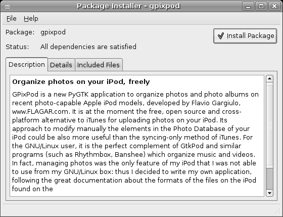 Once the gpixpod-0.4.4_all.deb package is on your hard disk, you have to install it. Rather than resort to the command line, as you did when installing DEB packages back in Chapter 9, let's go the easy route by just double-clicking the package itself. This will bring up the package installer, gdebi (Figure 16-11).