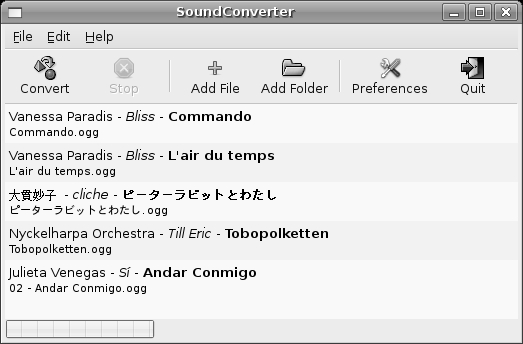 If you would like to convert MP3 to Ogg Vorbis format or vice versa, SoundConverter (shown in Figure 16-12) is an application that makes it all quite simple. Because SoundConverter does not come bundled with Ubuntu, you will have to install it yourself (if you didn't install it in Chapter 5). To do so, just run Synaptic, search for soundconverter, and install it.