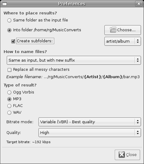 Once you've chosen the files to convert, you need to choose which format to convert them to. You can do this by clicking the Preferences button and then making your choice in the Preferences window (Figure 16-13). While you're there, it is also a good idea to tell SoundConverter to place your converted files in a location other than the folder where the original files are stored. Doing this prevents having to deal with duplicates in Linux audio playback applications that automatically scan your Music folder, such as amaroK. This is not an issue in either gtkpod or YamiPod, as they will not allow you to add Ogg Vorbis files to their library lists. You might also want to check the box next to the words Create subfolders in order to keep things organized. Once you have set things up and are ready to convert, click Close in the Preferences window, and then click Convert in the main window. SoundConverter will then begin doing its stuff.