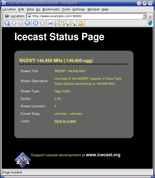 Once everything is up and running, you can access the Icecast status page on the port you specified in the configuration file. Figure 3 shows an example of an Icecast status page. Clicking on Click to Listen launches your audio player.
