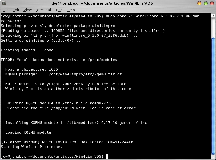 The win4linpro_6.3.0-07_i386.deb package was only 3.7MB and installed without a hitch. The VDS installation manual advises that the toolchain for supported distros must be installed prior to installing VDS. The reasoning behind this is that all Win4Lin products provide a specialized KQEMU module in order to deliver satisfactory speed performance. As long as you've dutifully installed the toolchain, the building and insertion of said module will be largely transparent to you (Figure 1).