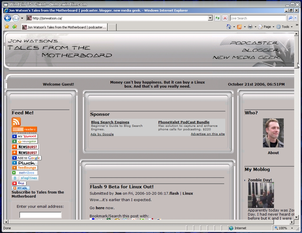The Win4Lin VDS can be configured to deliver a single application or an entire Windows desktop. We connected both configurations to the Win4Lin demo server and provided two screenshots. The first screenshot shows an entire Windows desktop configuration, and the second shows only Internet Explorer being delivered to our Linux desktop (Figures 4 and 5).