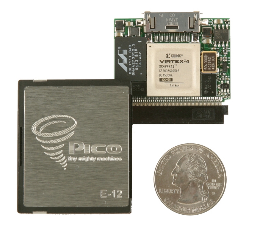 The E12 is a Compact Flash card—exactly like those in many digital cameras. It has only two connectors: a CF bus connection on one end and a 15-pin miniature connector on the other. There are no other external connections. The E12 is based on an FPGA. There are a few additional components, and a few fixed elements, such as the PPC405 CPU on the FPGA. A large part of the hardware is programmable. Most external connections are through the FPGA. Almost none of the “hardware” has form or meaning until the FPGA is loaded. Changing the bit file on the fly drops in a completely new hardware design. Welcome to a new era—even the hardware is software. The BIT image—in essence the program for the FPGA—is created by an FPGA developer, programmed into the Flash ROM and automagically loaded into the FPGA on power-up. Once this BIT image “boots”, hardware is created in the FPGA. Now, the pins on the connectors have meaning. The 15-pin connector provides three external connections for internal devices. It supports Ethernet, serial and JTAG connections through custom cables. The CF connector provides a bidirectional interface to a host—in most instances using a CardBus or PCMCIA adapter. Most of the pins on either connector can be whatever the FPGA programmer chooses to make them. Fielded systems may be plugged in to a CF connector solely to get power. E12's are used in daughter cards in typical embedded applications, on bus boards in high-performance computers in clusters and for applications, such as image processing or code cracking. They also are being used in applications with no operating system or extremely minimal operating systems.