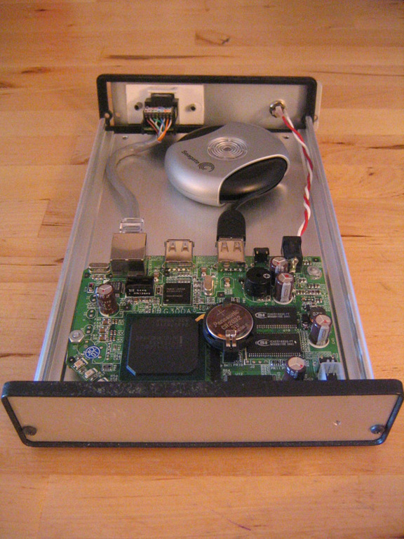 Because the NSLU doesn't have any built-in storage, we connect a small Seagate 5GB hard drive. The hard drive we use has the form factor of a small hockey puck. Richard Lussier, our local hardware maven, was able to package both the hard drive and the NSLU board tightly in a new enclosure, while maintaining the access to the other unused port. We suggest you do the same, if you can find your own Richard.