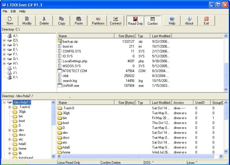 The previous tools lead us to the tool to which this article is dedicated. Unlike Ext2fsd and rfstool, which are specific to one particular class of filesystems, LTOOLS are more generic. They support ext2, ext3 and ReiserFS. LTOOLS are a set of command-line tools, along with two GUIs and a Web-based front end, to enable the reading of and writing to Linux ext2/3 and ReiserFS filesystems from nearly all DOS or Windows (XP, 2000, NT, ME, 9.x or 3.x) versions, running on the same machine or remotely. So, whenever you're running DOS or Windows, and you desperately need to read or write to a Linux partition, which may be on your own computer or any other, you can make use of LTOOLS. LTOOLS also is a great tool for fixing your Linux installation, if you do not have a live CD.