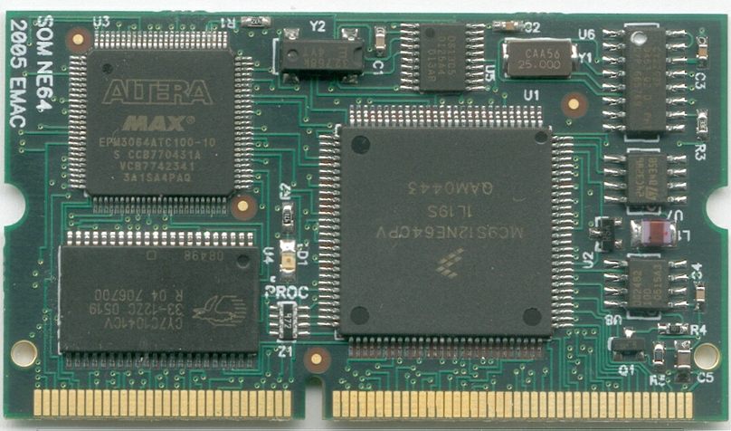 The EMAC folks have let us know about their new 16-bit, System on Module Internet-appliance engine, which they have ubercreatively named SoM-NE64M. The SoM-NE64M module is based on the Freescale ColdFire MC9S12NE64, 16-bit, 68HC12-compatible processor with built-in Ethernet MAC and PHY and two serial ports. It also features 64KB of Flash, 32KB of EEPROM and 8KB of RAM, with room for up to 512KB. The aforementioned functionality is integrated into a diminutive board—smaller than a business card and using less than a Watt of power—and is designed to plug in to a custom carrier board. Applications for the SoM-NE64 can be programmed using GNU tools within an Eclipse IDE or with CodeWarrior. One of the product's advantages, says EMAC, is “more functionality built in than many other SoM designs”, making the carrier board easier to design and produce and thus lowering cost and time to market. Target applications are Web/network data acquisition and control.