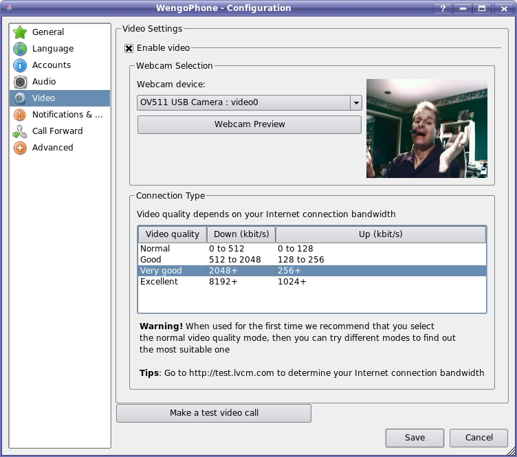 You can fine-tune a number of WengoPhone's features through the configuration dialog. Click Tools on the menu bar, and select Configuration to open the settings window. In Figure 6, I am using the dialog to enable and configure my Webcam.