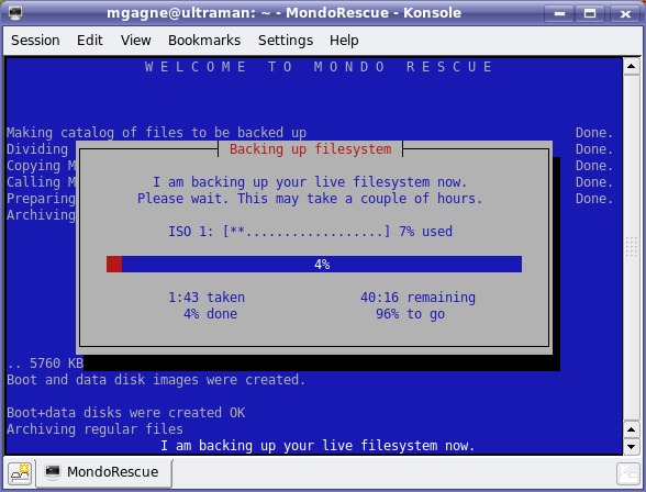 What follows next is interesting only the first few times—mostly because you probably have better things to do with your time. The screen shows a report of the backup broken up into file sets, the creation of boot diskettes and so on. At this point, Mondo Rescue is ready to back up your data and displays a nice progress bar, telling you which ISO is being written, how much of it is done and how long you can expect the whole process to take (Figure 5).