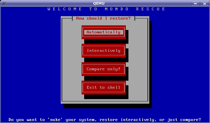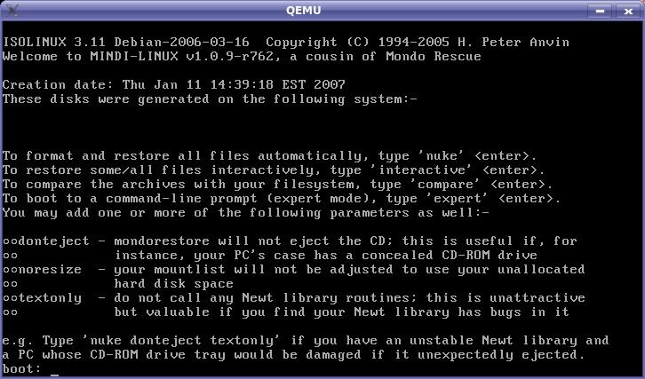 Eventually, you will have a complete backup and, in this case, one or more ISO images that you can burn to a CD or DVD. The first disk in the set is the one from which you'll want to boot. In a few seconds, you'll see a menu like the one shown in Figure 6 (currently running in a QEMU virtual machine).