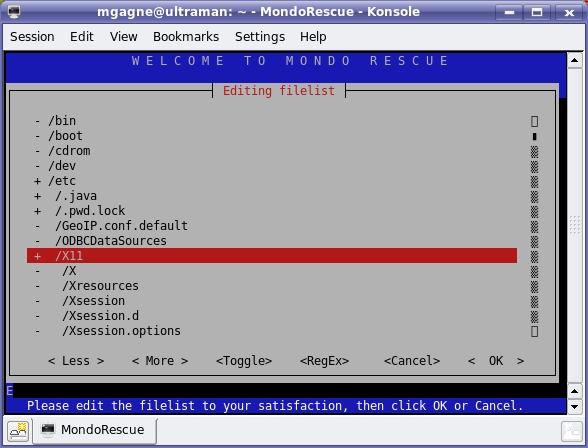 It may take a few seconds for the program to extract the file catalog, but soon you'll be presented with a list of files and folders starting from the root directory. Using the arrow keys, you can navigate up and down through the list. Along the bottom of this screen are text buttons labeled Less, More, Toggle, RegEx, Cancel and OK (Figure 8). To expand a folder or directory, cursor to the right, go to the More button, and press Enter. To select a file or folder for restoring, cursor right again to the Toggle button, and press Enter. An asterisk appears to the left of the filename you've selected. Press Enter again to deselect it. To continue searching through the file list, cursor left past the Less button, and you can scroll up and down through the list again.