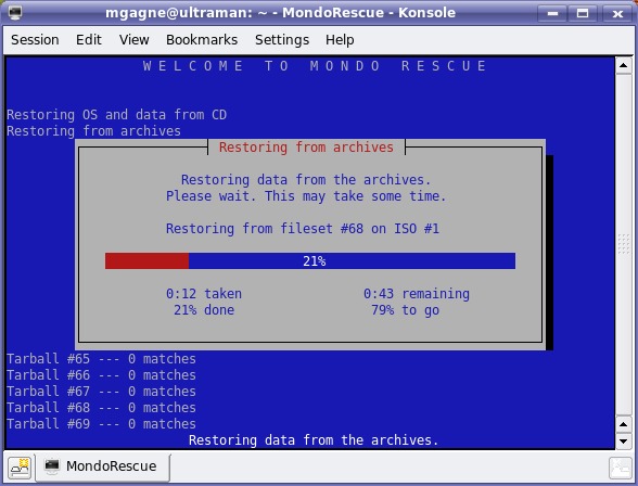The dialog displays the tarball in which it is currently searching, on which disc, a percentage of completion and an estimated time remaining before all your files are restored. That's it. Your all-important files (and, they are all important when lost) have been restored.