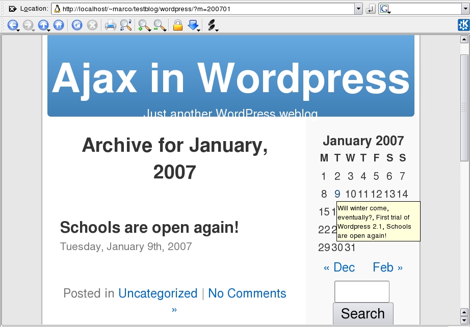 WordPress publishes and archives authors' posts in chronological order without any effort. It often comes naturally, both for you and your readers, to track and retrieve such posts through a calendar in the home page. WordPress does have a built-in calendar, but the Ajax-based one shown in Figure 1 is more dynamic and pleasant to use. The installation is simple, but not without a few issues. According to the README file distributed with the code, you must uncompress the tarball only in the WordPress plugins folder, activate it in the Administration pages, and add, in the index.php files of your WordPress theme, these three lines of code right where you want to place the calendar: