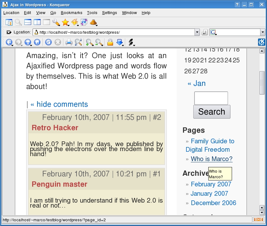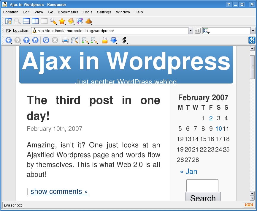 AjaxWp depends on a few JavaScript libraries that are included in the distribution. To use this plugin, download the latest tarball from the home page, unpack it, and move its JavaScript folder, the animated GIF and a PHP file called, you guessed it, ajax-wp.php, inside your WordPress installation. Then the fun begins.