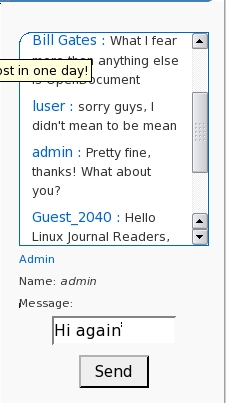 The scrollbar on the right allows newcomers to follow the whole conversation (Figure 5). The refresh interval is programmable. When it expires, new posts appear highlighted in a different color, which then fades away in the background after an equally programmable interval.