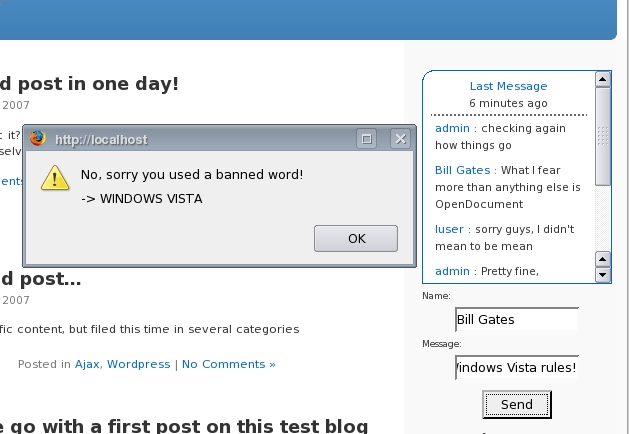 Security-conscious readers will immediately spot the potential for abuse here, but Shoutbox has two configurable mechanisms to prevent spammers from filling it with garbage. One is a place (Options→Discussion→Comments moderation) where you can enter a list of banned words, URLs and sentences. The package includes a sample word list; to add new ones, simply type them in the right place on the list. People trying to use banned words will see the alert box shown in Figure 6. The drawback in using the banned word list is that it requires continuous monitoring and maintenance. To avoid this burden, it is much better, without giving up the list itself, to set Shoutbox to accept comments only from registered users. Anonymous visitors still will be able to see the chat in progress.