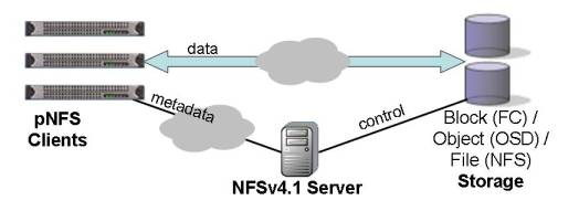 NFSv4.0 improved the security model from NFSv3.0, which is the most widely deployed version today, and it folds in file locking that was previously implemented under a different protocol. NFSv4.0 has an extensible architecture to allow easier evolution of the standard. For example, the proposed NFSv4.1 standard evolves NFS to include a high-speed parallel filesystem. The basic architecture of pNFS is shown in Figure 1.
