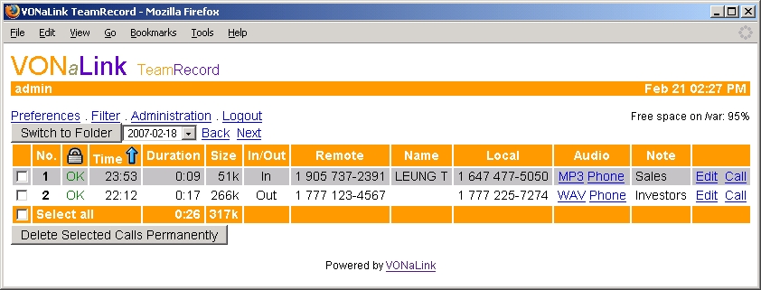 Arcosoft joins the growing list of companies that have come to their senses: it just released a Linux version of its VONaLink TeamRecord VoIP-based call-recording application. TeamRecord works with any VoIP phone system based on the SIP standard (think Asterisk), centrally recording all phone calls for a company's workgroup. VONaLink says that TeamRecord, for instance, allows “business transactions over the phone to be verified and disputes resolved” or comply with Sarbanes-Oxley or other disclosure provisions. Furthermore, TeamRecord replaces both expensive analog recording equipment and proprietary products from the dreaded phone company. The recording process involves unobtrusive monitoring of network packets via the port mirroring capability of a network switch and results in an inaudibly watermarked MP3 or WAV file. Users can listen to recordings of their own calls from a Web browser. TeamRecord is available for x86 Linux and Windows platforms.