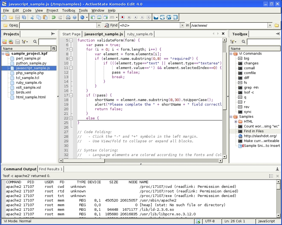 ActiveState recently released its new version 4.0 of Komodo Edit, the firm's free, multilanguage editor for dynamic languages. Based on ActiveState's Komodo IDE 4.0, Komodo Edit not only supports Perl, PHP, Python, Ruby and Tcl, but also client-side languages and Ajax technologies, including JavaScript, CSS, HTML and XML. OS support includes Linux, Mac OS X and Windows. Among the product's advantages, says ActiveState, are capability additions via .xpi extensions, storage of configurable elements (such as run commands, macros, code snippets and so on), syntax checking and coloring, an active community site and more. A gratis download of Komodo Edit is available from ActiveState's Web site.