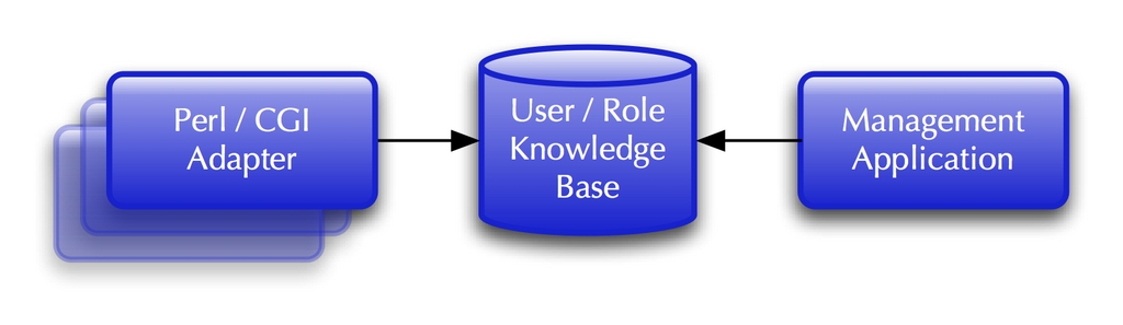 The plan for the new system features three independent pieces: a database containing the knowledge of users and their roles, a Ruby on Rails application for administrators to manage the database, and a set of adapter libraries for each application programming environment in use. For our scenario, I wrote a Perl module to connect our legacy applications to the new framework (Figure 1).