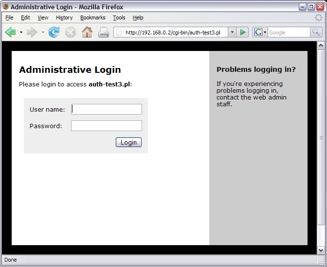 auth_login.cgi: responsible for the simple task of authenticating the user and restarting the access checking. In our case, it connects to the LDAP system and looks to see if the given login information is correct. If it is, then this fact is saved in a session/cookie, and the originally requested CGI script is re-executed.