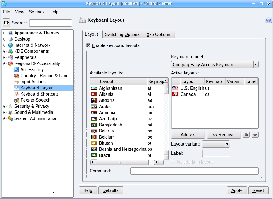 Let's start with some KDE solutions. Fire up kcontrol, the KDE Control Center. Under Regional & Accessibility, select the submenu for Keyboard Layout. On the right-hand pane, you'll see a number of flags from different countries. Click Enable keyboard layouts to un-gray these choices. If you installed your system using US English as your language of choice, the default is to provide you with US English. Because my background is French Canadian rather than French from France, I am most familiar with a North American keyboard layout, including the French Canadian keyboard (I honestly have no idea how a French keyboard in France is laid out). Consequently, I always add Canada to that list (Figure 2).