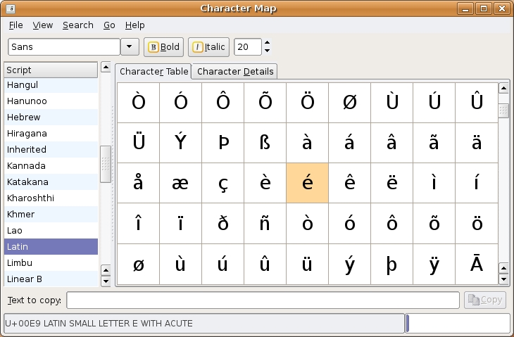 Select a font from the drop-down list at top. Then, if necessary, select an alternate character table (the Latin set is at 0 on my system). If you hover your mouse pointer over a character, you'll see its Unicode and ASCII value. To use a character in an application (such as e-mail), click on that character, and it will appear in the text field at the bottom of the dialog. You even can enter multiple characters if you want. To use what you have selected, click the To Clipboard button, and then paste the result into your application of choice.