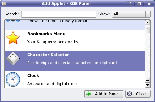 To add the applet, right-click on a blank section of your Kicker panel, and select Add Applet to Panel. The Add Applet dialog appears with a list of programs you can use to populate your Kicker panel (Figure 5). Each program (or applet) is listed alphabetically with a short description. Look for the Character Selector. To add the applet, simply click the Add to Panel button.
