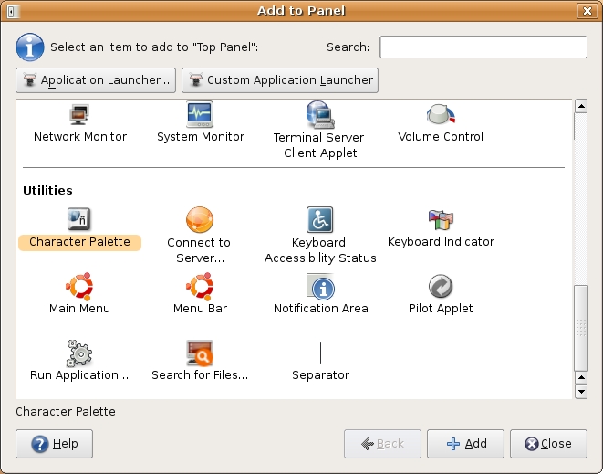 Those of you who are running GNOME as your default desktop environment have a similar tool at your disposal, and it also is an applet. Right-click on the bottom (or top) panel and select Add to Panel. A window of the same name appears with a list of available applets (Figure 7). Scroll down until you see the Utilities section. There you will find an applet named Character Palette. Select it, then click Add or simply drag the applet to the panel in the location of your choice.