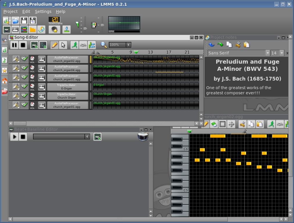 Once you dive into the world of LMMS, a steep learning curve presents itself. Some tutorials and demos are included, but these will leave most users in the dark on many issues (but they are worth examining as they do uncover the uses of many GUI items). The demos are indeed worth a look and show off the capabilities of the program. The demos include Bach's “Preludium and Fuge in A Minor”, which is impressive when you watch the keys played in real time under each instrument's settings, and other cool demos are included that range from general dance music to the occasional more atmospheric piece.