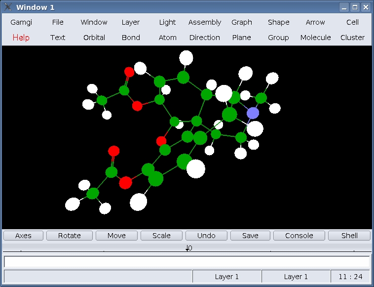 Once all that nasty stuff is out of the way, the weird science can begin. Some interesting templates and tutorials have been included in GAMGI's dat directory. From the menu, choose File→Import and choose an atomic structure at random. Ever wondered what adrenaline looks like? Try molecule/drugs/adrenaline.xml. Presto! An adrenaline molecule appears in the main black window. To play around with the view, press and hold the left, middle or right mouse buttons and move the mouse around. The left button controls rotation, the middle buttons controls the X and Y axes, and the right button controls the zoom function. You have to admit, it is pretty cool to play with!