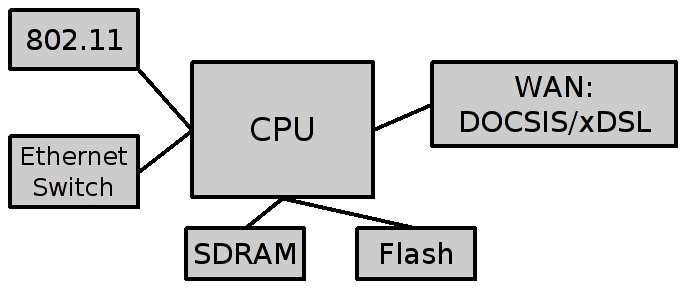 If you decide to take a look inside your 802.11 access point or ADSL gateway, which probably will void your warranty, you will find an embedded board with a CPU (probably some MIPS variant), Ethernet switch, ADSL/DOCSIS and 802.11 chips, as illustrated in Figure 1.