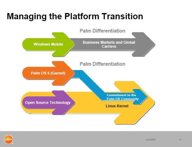 Then, at its Analyst and Investor Day in April 2007, Palm announced plans to moosh its PalmOS development together with development atop the Linux kernel, along with plans to come out with Linux-based Palm products before the end of this year. We don't have more specifics at press time, but we do have a copy of a visual used by Palm at the announcement (Figure 1).