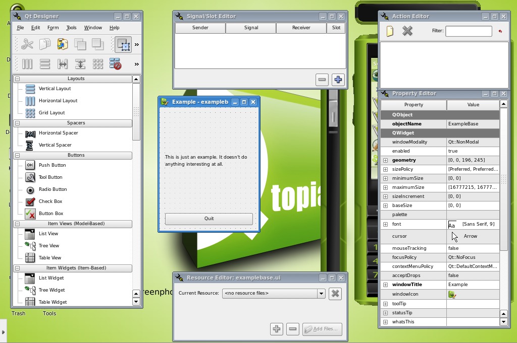 Qtopia development will make any Qt or KDE developer feel right at home, as it is quite compatible with the desktop version of Qt. There are a few minor differences, as we will see in the example application in the Greenphone SDK found at ~/projects/application.