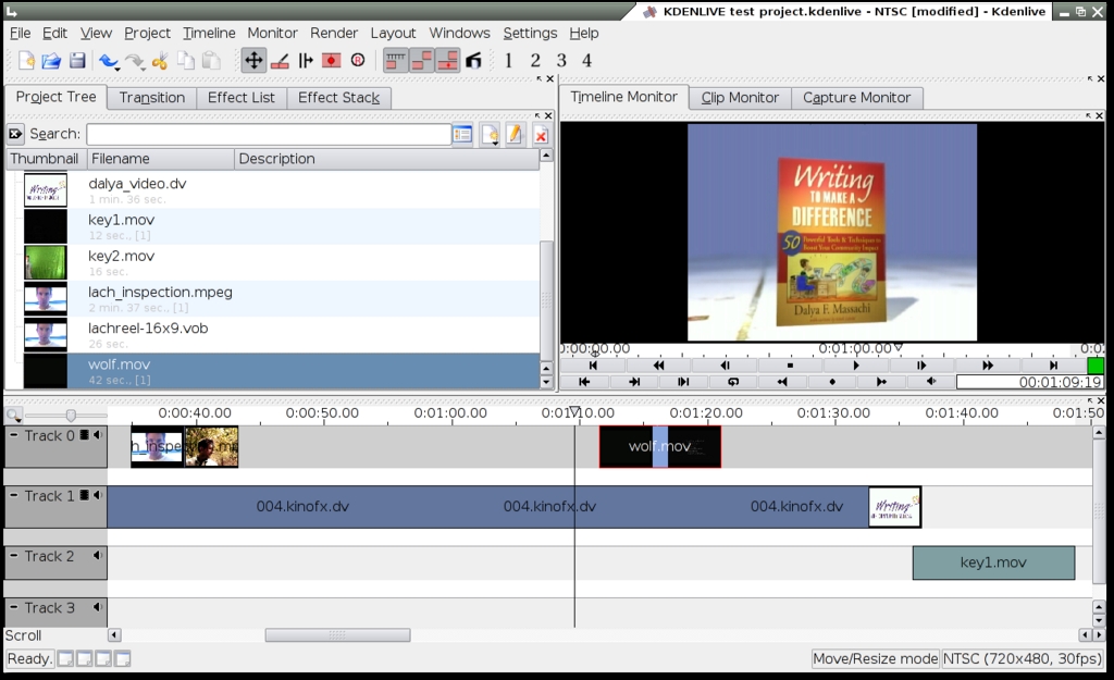 Fortunately, this is open source. And, the odds are that somewhere, someone has run into the same problem before and done something about it. In this case, my friend Dan Dennedy (developer of Kino) pointed me to a new video editing project named KDENLIVE (yes, it really is an acronym: the K Desktop Environment Non-LInear Video Editor), which is based upon his multitrack engine MLT (Mutton, Lettuce and Tomato—the XML file format it writes to, appropriately enough, is called Westley).
