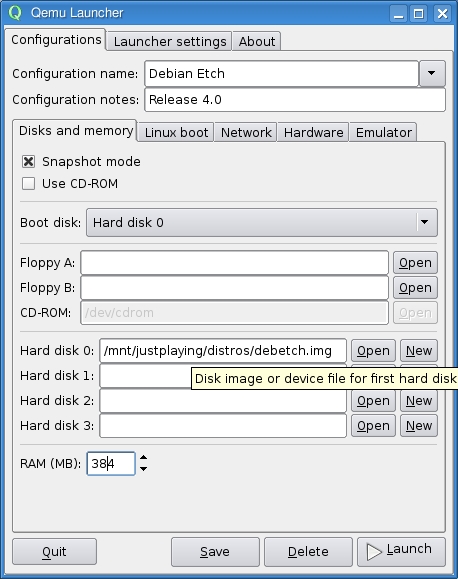 Qemu Launcher provides a front end to basic as well as advanced features of the QEMU command suite. There are three tabs: Configurations, Launcher Settings and About. Most of the action takes place under the first tab. For starters, you can create a set of configurations based on existing QEMU images simply by entering a configuration name, a file location for your hard disk (the image created by qemu-img) and defining the memory you want to allocate. Click the Save button, and you are ready to start your virtual machine by clicking the Launch button on the lower right of the Qemu Launcher interface. In Figure 3, I've added a profile for Debian Etch 4.0 to launch with 384MB of RAM.