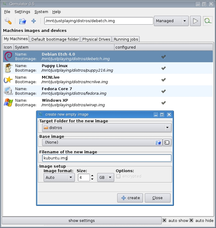 The final item on tonight's menu, Rainer Haage's Qemulator, is a must-see stop on your search for the ultimate QEMU front end to all your ultimate Linux (virtual) boxes. This impressive and feature-rich application covers pretty much every aspect of QEMU's operation, including creating disk images (Figure 5), installing distributions, monitoring running instances and so much more.