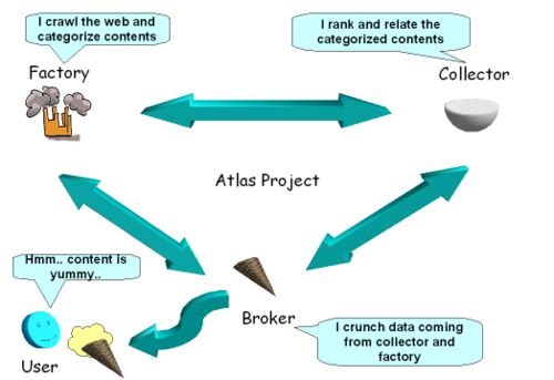 JM: Yes, the fundamental unit of Atlas is a “Knugget”, a Knowledge Nugget essentially, a search result. A Factory adds value based on what it knows about the content; a Collector adds value based on what it knows about keywords and ranking Knuggets; and a Broker adds value based on what Collectors it knows and what value they provide in aggregate.