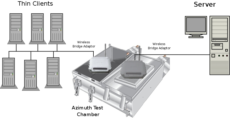 Figure 2. Six thin clients are connected to a hub, and in turn, this is connected to wireless bridge device. On the other side of the bridge is the server. Both wireless devices are placed in the Azimuth chamber.