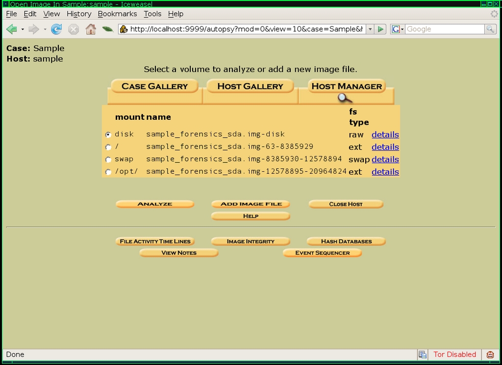 When you add the host and go back to the Host Gallery, select the host to analyze and click OK to go to the Host Manager page. If this is a new host, the first thing you should do is click Add Image File to add the image you created previously. The image page has only three fields: Location, Type and Import Method. Autopsy expects that the image is available somewhere on the local computer—either actually on the local disk or via an NFS or SMB mount. Type the full file path to the image file in the Location field. The Type field lets you inform Autopsy of the type of image you created. If you imaged the entire drive, select Disk; otherwise, select Partition. If you select Disk, Autopsy scans the partition table for you and lists all the image's partitions.