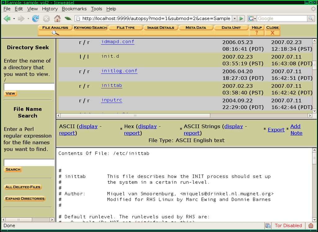 Each of the files or directories in the File Analysis page are hyperlinked. If you click a directory, the page changes to list the contents of that directory. If you click a file, the bottom-right frame changes to list the contents of the file (even if it's binary) along with a number of functions you can perform on that file. You can display the ASCII or Hex versions of a file or have Autopsy scan the file and display only the ASCII strings inside. This feature is particularly handy to try on suspected trojan files. Often the ASCII strings inside a trojan binary list strange IRC channels or other remote servers or passwords the attacker is using. You also can export a copy of the file to your local disk for further examination.