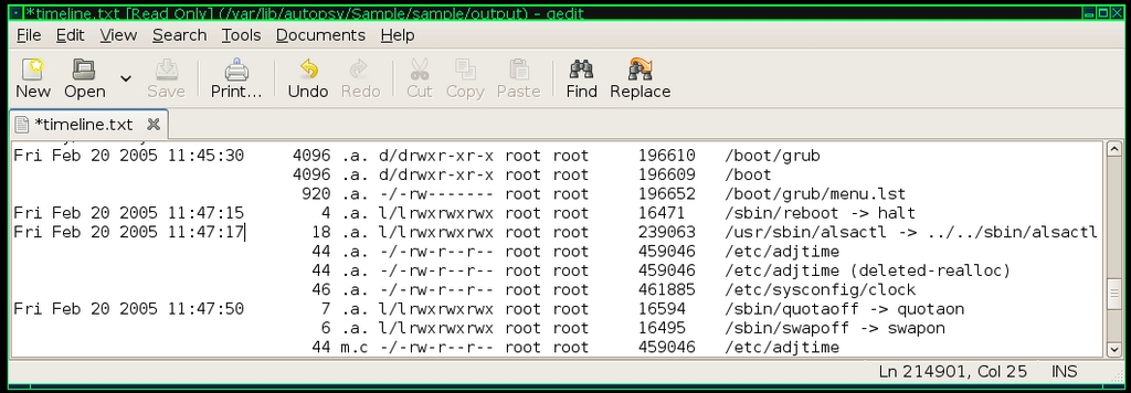 The timeline.txt file lists every file on your image sorted by MAC time. This file contains a lot of information, but once you figure out what each field stands for, it's easier to decipher. The first column lists the time in question for a file followed by the file size. The next field denotes whether this time was a time the file was modified, accessed, changed or any combination of the three. If a file was both modified and accessed at this time, but its metadata was not changed, you would see “ma.” in this field. The next field lists the file permissions, followed by the user and group that owned the file. The final two fields list the filesystem inode and the full path to the file or directory. Note that if a group of files has the same time, only the first time field is filled.