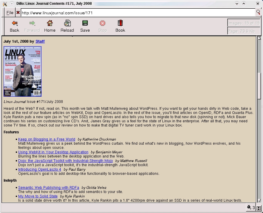 Another alternative to the monster browsers of today, and one that is entirely graphical in nature, is Dillo. Created by Jorge Arellano Cid, Dillo's demands on your system are meager, and its performance is seriously snappy. It won't render complex pages or tables particularly well, but it does support image browsing and bookmarks. Dillo's small size, speed and tiny memory footprint can sometimes make up for its limited features. Figure 3 shows Dillo in action.