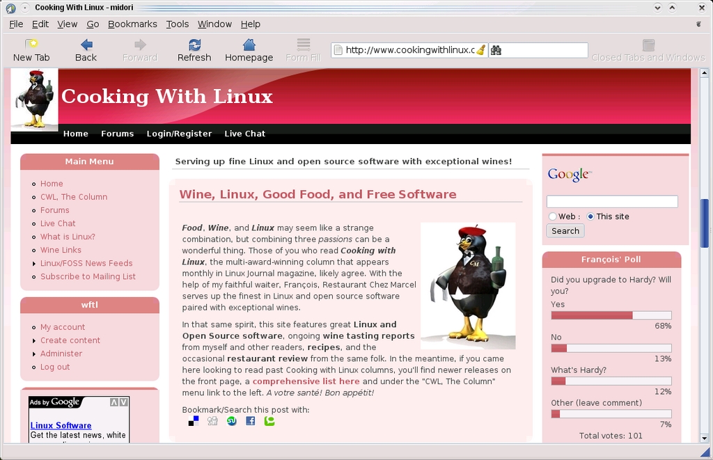Our next selection for tonight is Christian Dywan's Midori, a great little Web browser whose rendering engine uses WebKit instead of Gecko. For those who may not know, WebKit is an open-source rendering engine based on KHTML, the HTML rendering engine created by the fine people of the KDE Project. Midori (Figure 4) also features tabbed browsing, custom context menus, configurable interface, JavaScript plugins and, of course, peppy rendering, courtesy of WebKit.