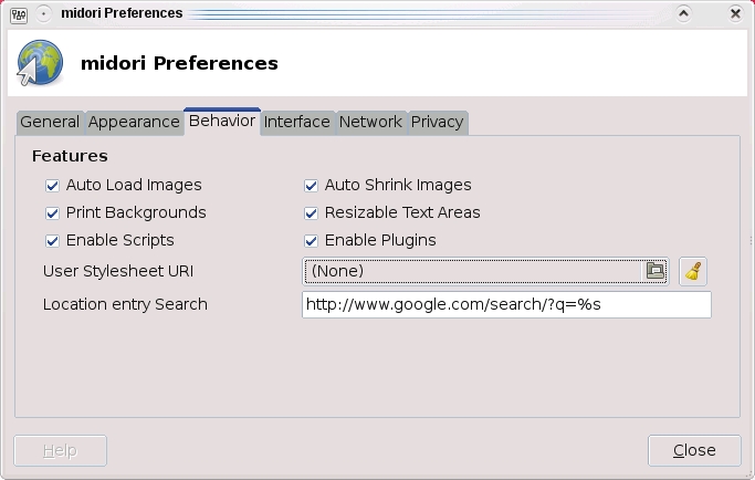 Changes to Midori's interface and behavior are largely controlled via the Preferences dialog (Figure 5). Click Edit on the menu bar, and select Preferences. From there, you can set a default home page, change the look and feel (including default fonts), and more. You'll also find evidence of Midori's young age when you run into pages that don't yet allow edits.