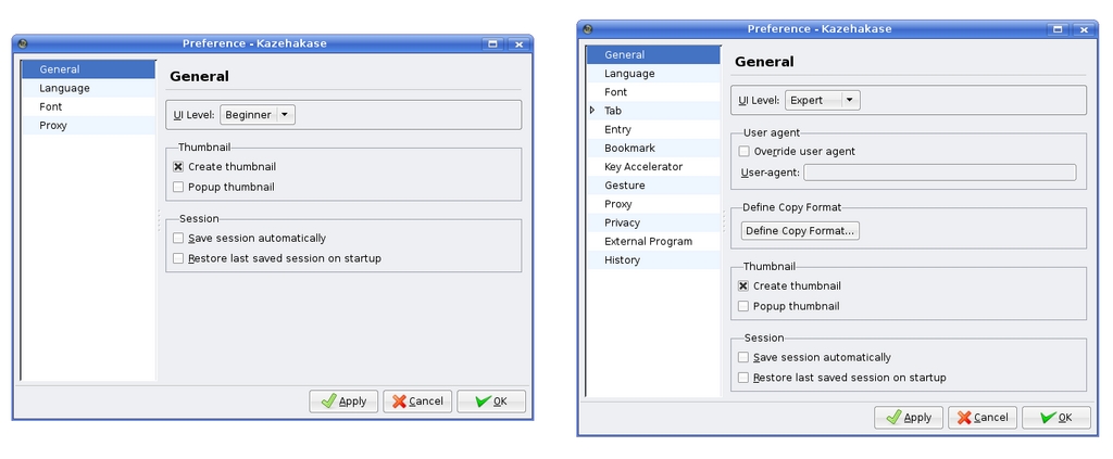 Figure 7. On the left, you can see Kazehakase's basic (or beginner) preferences. To the right is the same dialog but in expert mode.