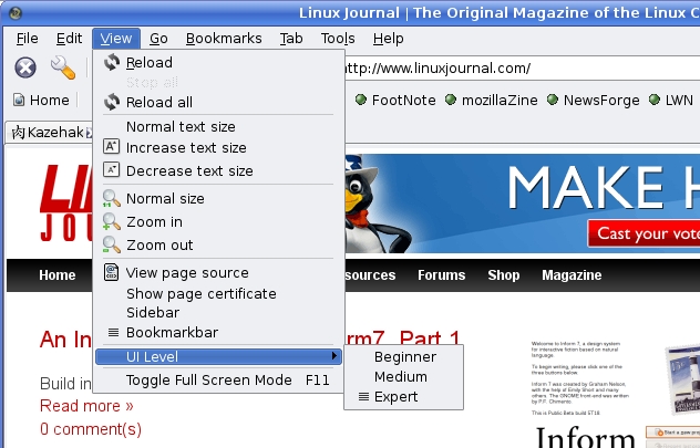 Possibly the coolest thing about Kazehakase is its graded user interface. It's a great concept. By default, the user interface is kept as simple as possible, providing users with only the basics both in terms of menu options and configuration of system preferences. The user interface level (UI levels) can be set to beginner, medium or expert. At each level, you find additional hidden gems under the surface that let you fine-tune the browser. There are two ways to change the UI level. The first is by changing the preferences. To get to the system preferences, click Edit on the menu bar, then select Preference. The beginner UI preferences window appears with the main options to the right and a sidebar menu on the left (Figure 7).